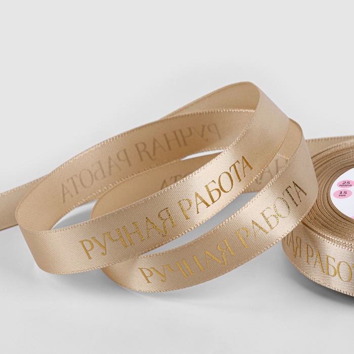 Лента атласная с тиснением «Ручная работа», 15 мм, 23±1 м, золотая №123