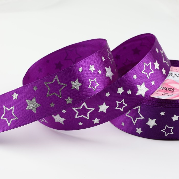 Лента атласная с тиснением «Звёзды», 25 мм, 18±1 м, фиолетовая, серебряная №145