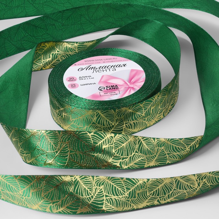 Лента атласная с тиснением «Папоротник», 25 мм, 18±1 м, изумрудный, золотая №168