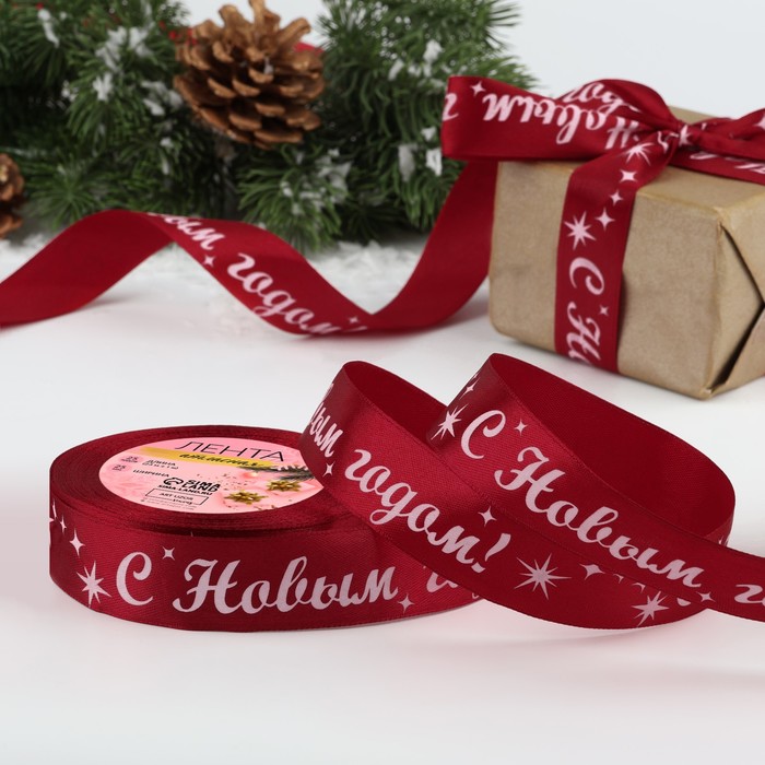 Лента атласная «С Новым годом!», 25 мм, 23±1 м, красная