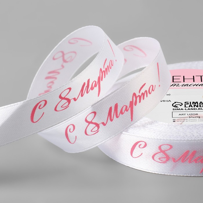 Лента атласная «С 8 Марта», 15 мм, 23±1 м, белая, розовая №001