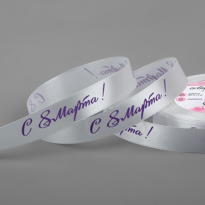 Лента атласная «С 8 Марта», 15 мм, 23±1 м, белая, сиреневая №001