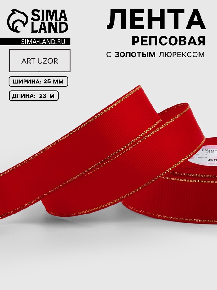 Лента репсовая, с золотым люрексом, 25 мм, 23±1 м, красная №026