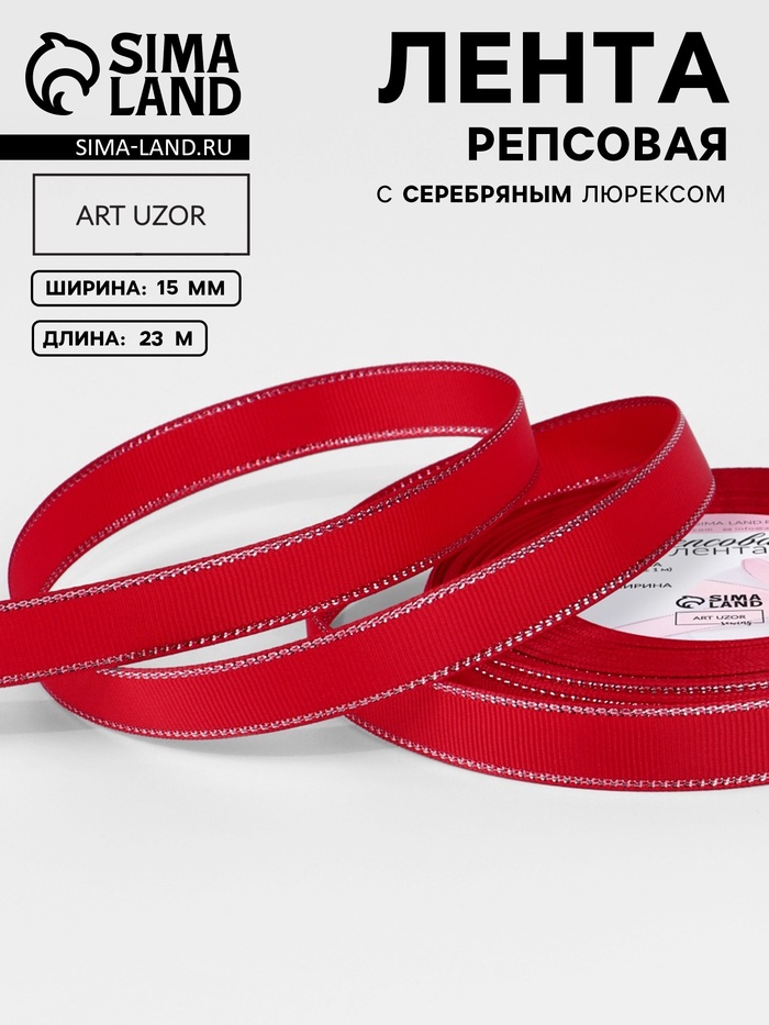 Лента репсовая, с серебряным люрексом, 15 мм, 23±1 м, красная №026
