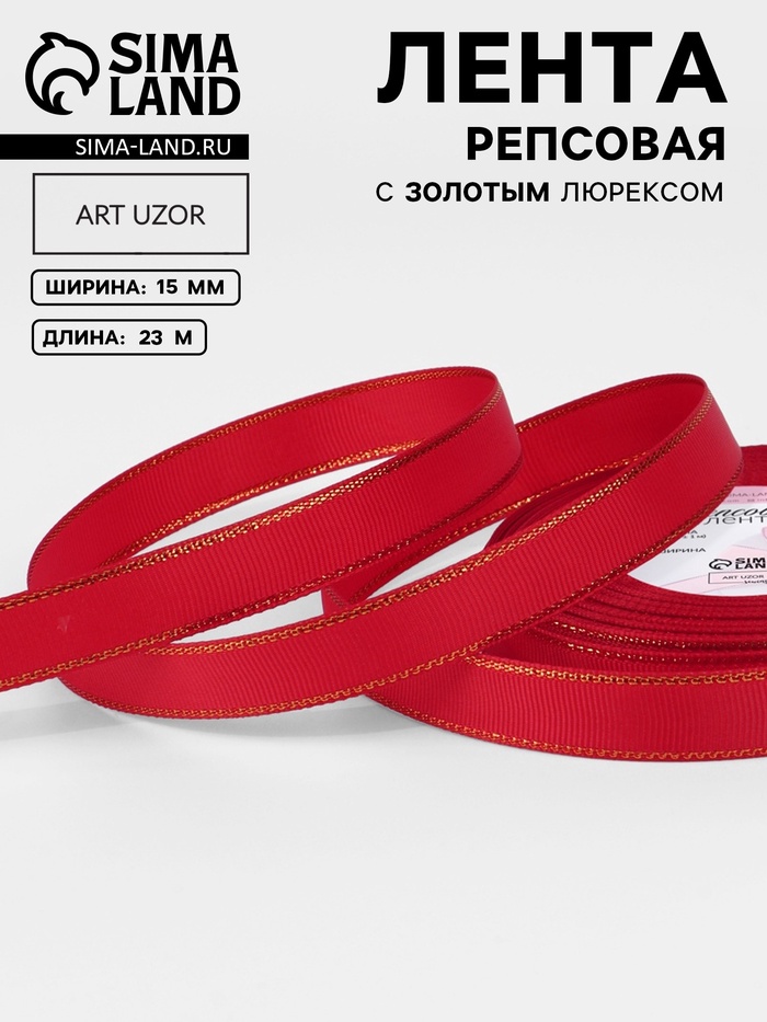 Лента репсовая, с золотым люрексом, 15 мм, 23±1 м, красная №026
