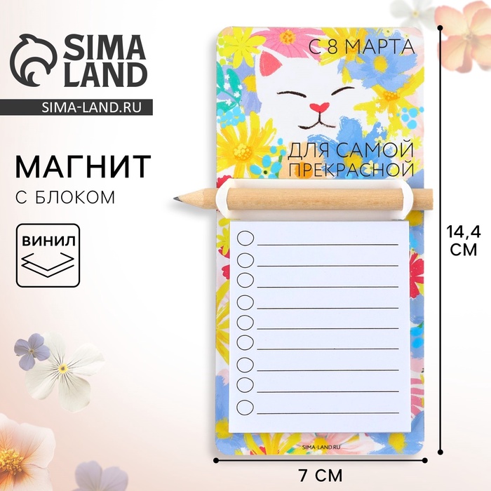 Магнит с блоком для записи и карандашом «Для самой прекрасной.8 Марта», 7×14.4 см
