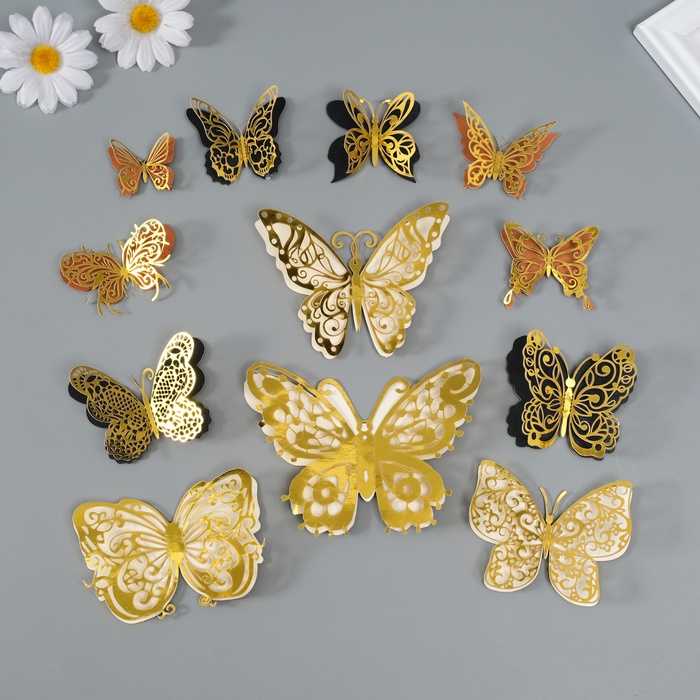 Набор магнитов на холодильник «Бабочки ажурные с золотом», 12 шт., картон, двойные крылья, h=4-10 см