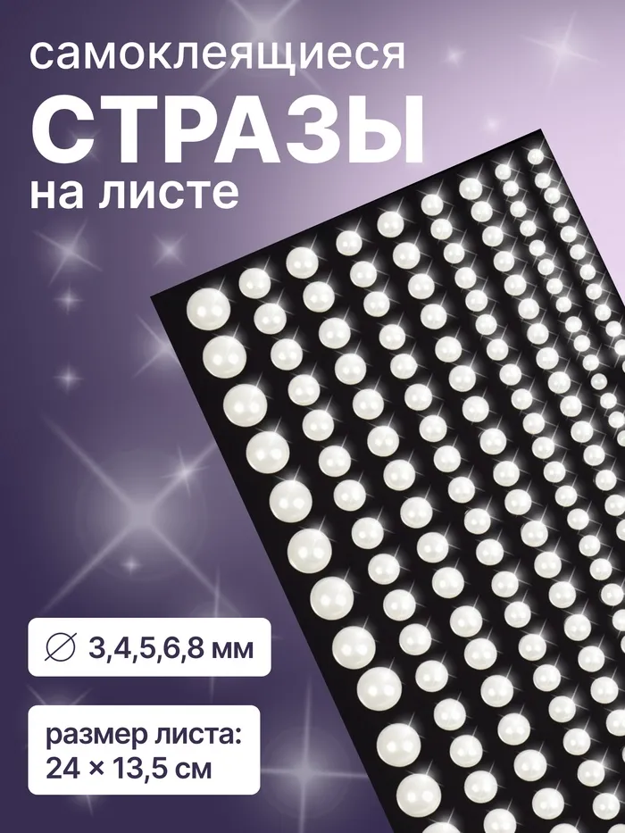 Стразы жемчужные для декора, на клеевой основе, 15×8 см, d=3/4/5/6/8 мм, белые