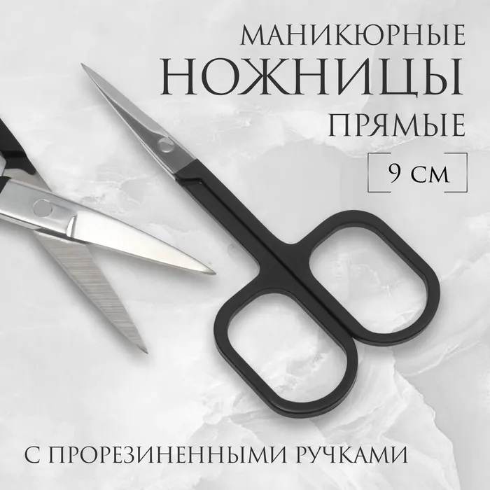 Ножницы маникюрные, узкие, прямые, с прорезиненными ручками, 9 см, чёрные