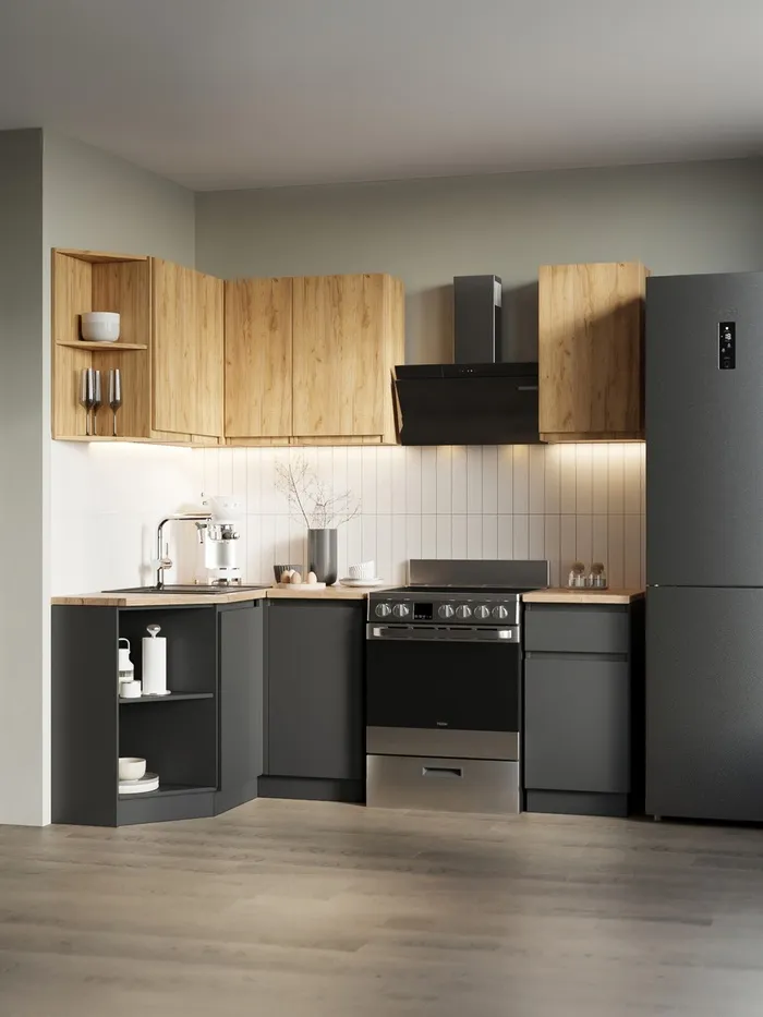 Кухонный гарнитур угловой «Лира», с столешницей, 1300×2000 мм, цвет графит/дуб крафт золотой/дуб кера
