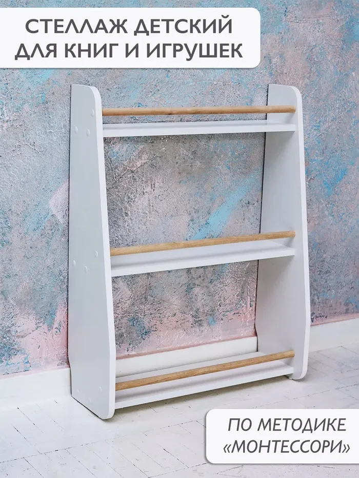 Стеллаж десткий для игрушек и книг, 604×220×760 мм, ЛДСП/массив дерева, цвет белый/натуральный