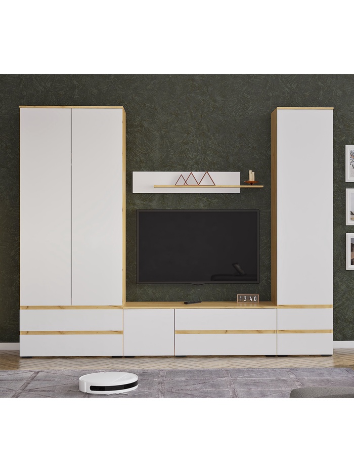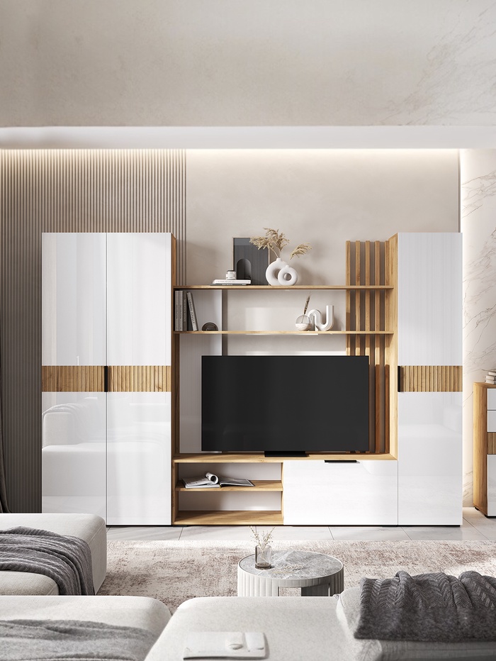 Гостиная «Роджина», 2600×350×1826 мм, цвет белый глянец/дуб крафт