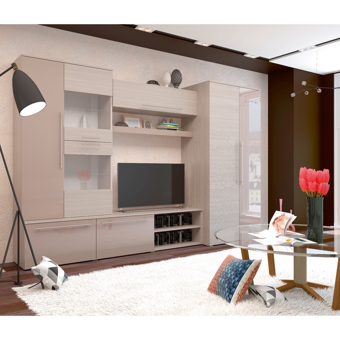 Гостиная «Монако», 3000×574×2000 мм, цвет ясень шимо светлый/капучино МДФ