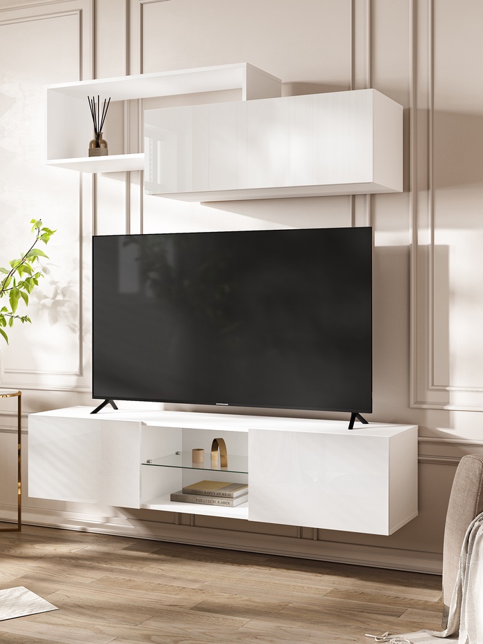 Гостиная «Норд», тумба 1500×350×330 мм, полка 1388×350×460 мм, цвет белый глянец/белый