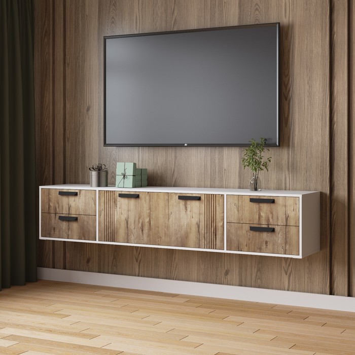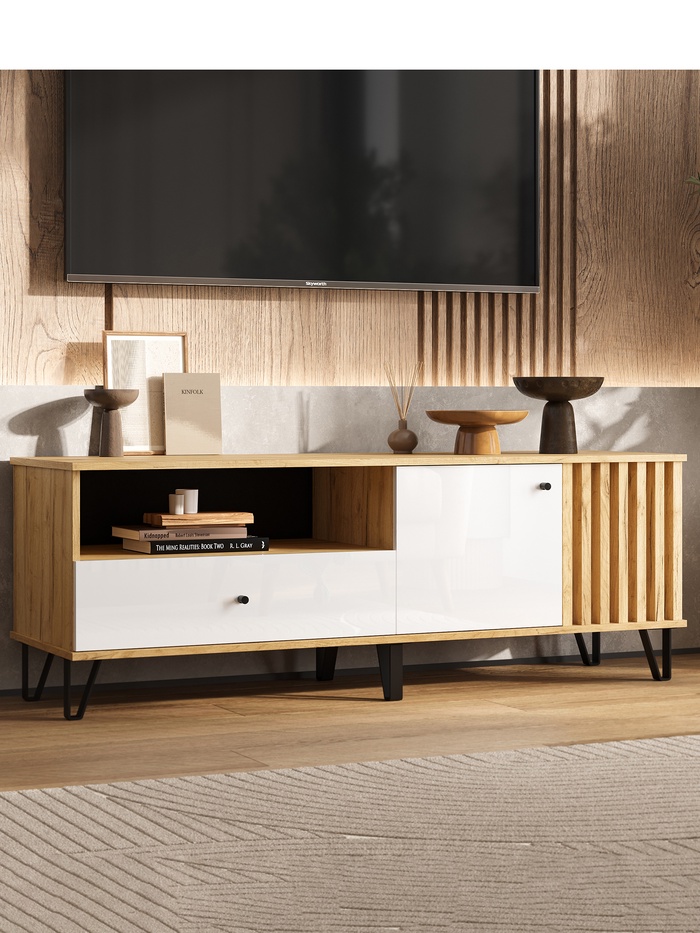 Тумба под ТВ «Роджина», 1502×426×511 мм, цвет белый глянец/дуб крафт