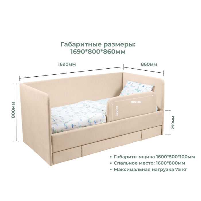 Кровать диван ЮНА 160х80 с выкатным ящиком, бортиком, бежевый