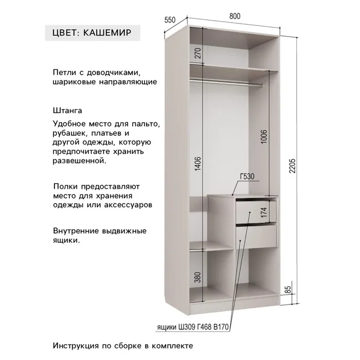 Шкаф двухстворчатый Чарли 22, 800х550х2205, Кашемир