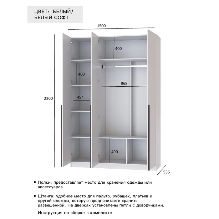 Шкаф трёхстворчатый для одежды «Стронг», с доводчиками, 1500×536×2200 мм, цвет белый/белый софт