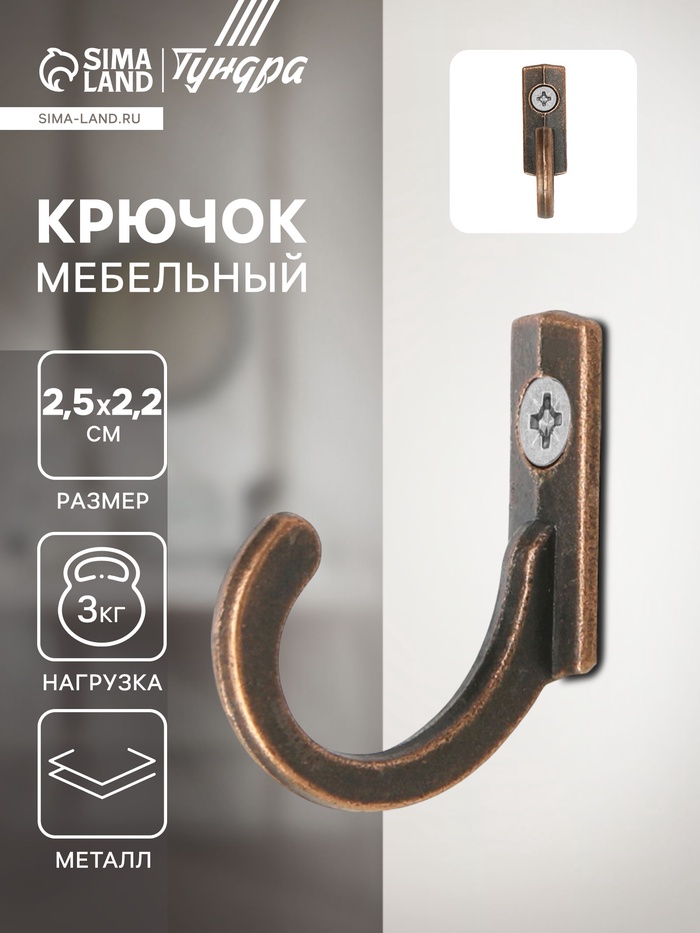 Крючок мебельный ТУНДРА TKO015, однорожковый, медь, 1000 шт.