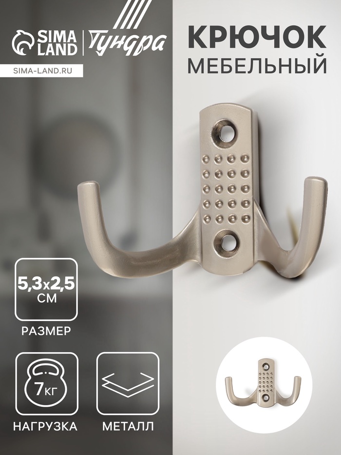 Крючок мебельный ТУНДРА TKd=011SS, двухрожковый, цвет сатиновый никель