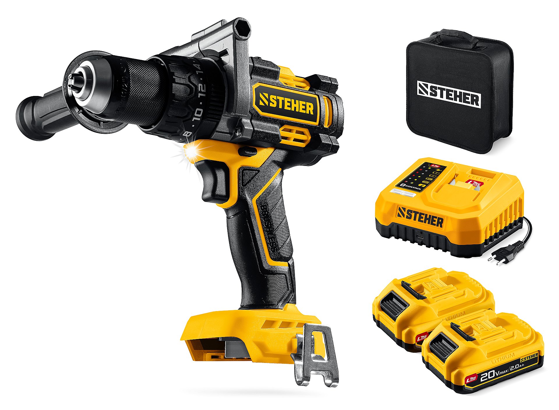 STEHER 20 В, 165 Н·м, 2 АКБ LMS (2 А·ч), бесщеточная ударная дрель-шуруповерт, сумка (CBS-165-22)