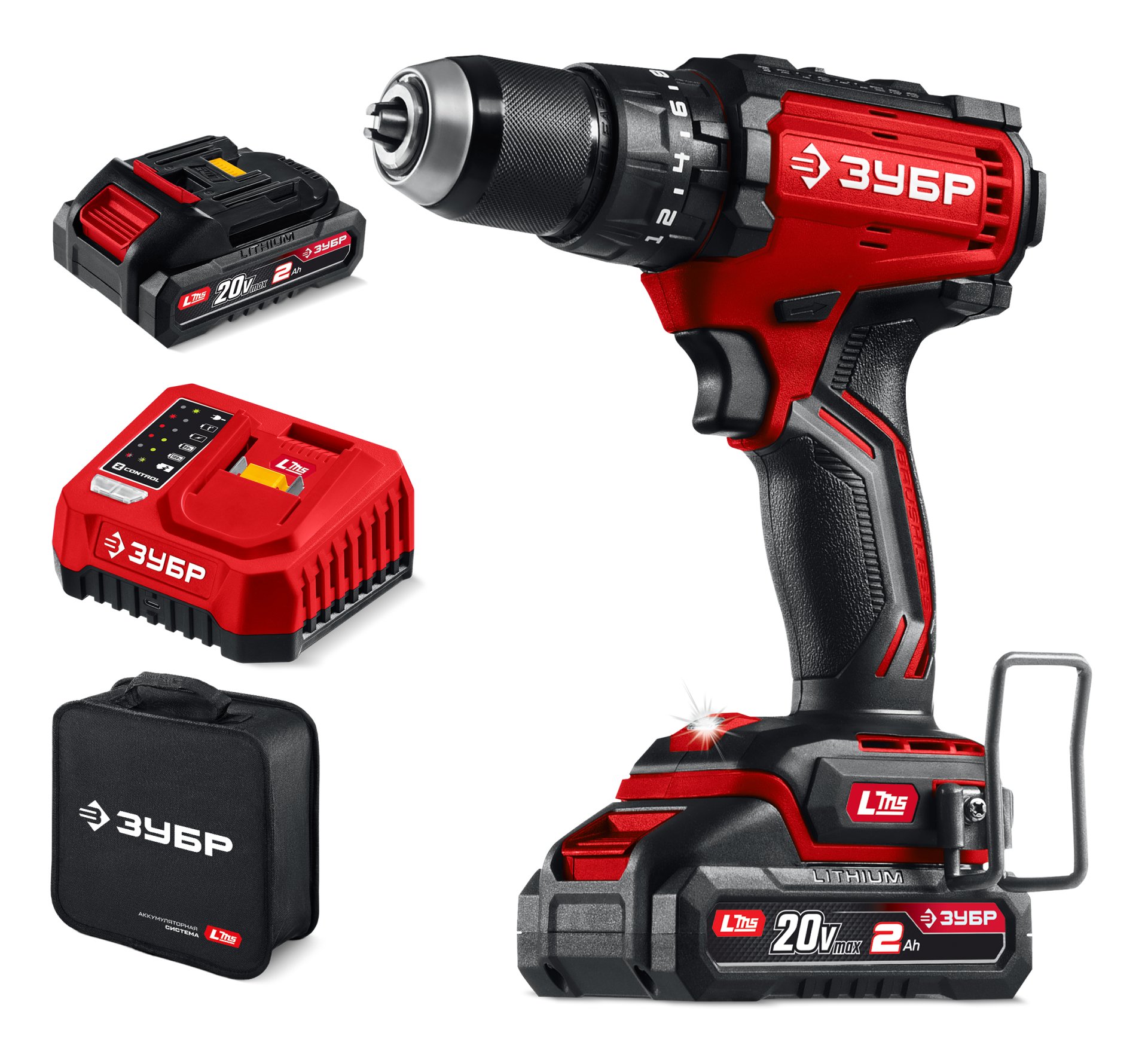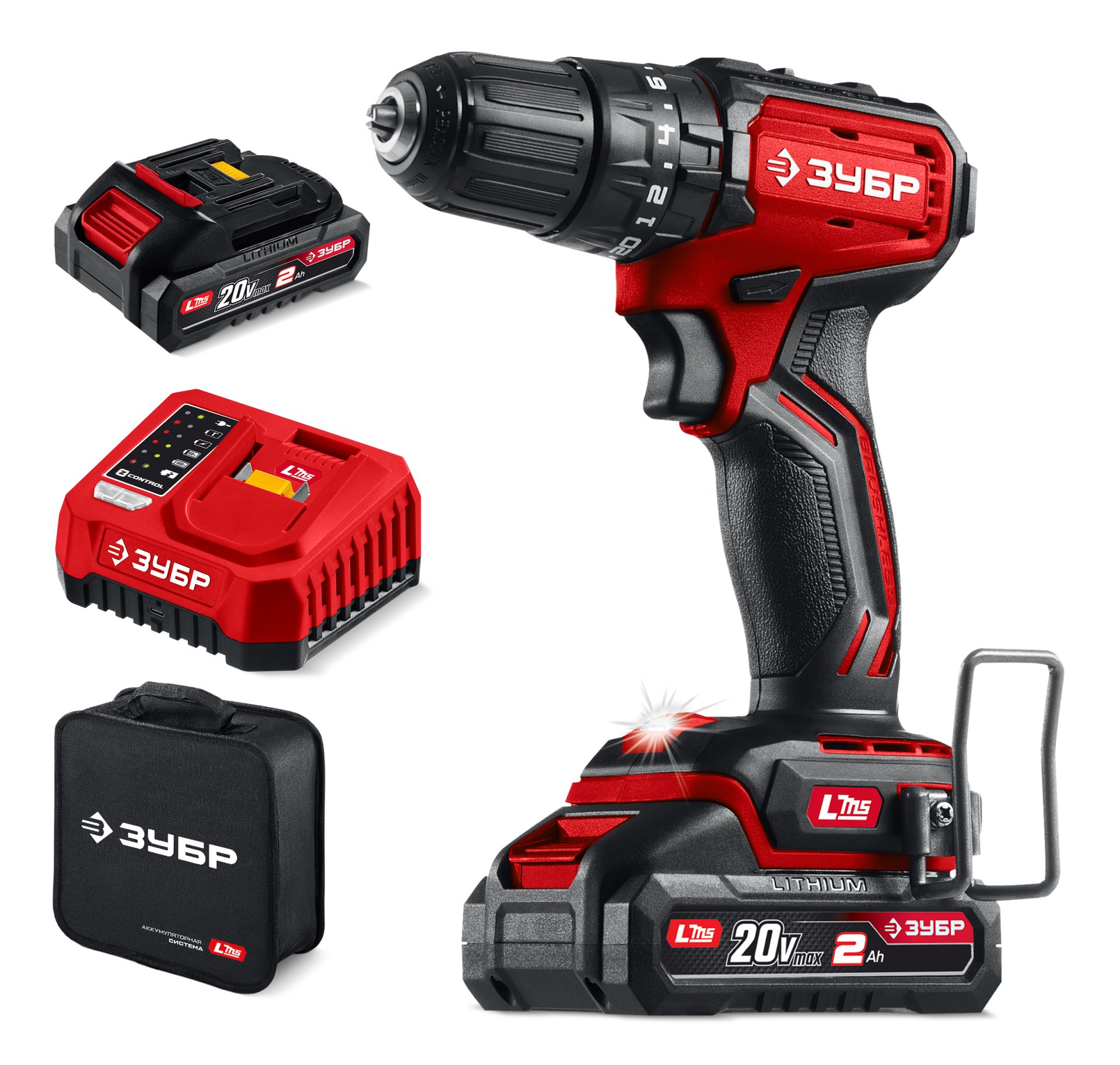 ЗУБР 20 В, 45 Н·м, 2 АКБ LMS (2 А·ч), бесщеточная ударная дрель-шуруповерт, сумка (ДБУ-45-22)