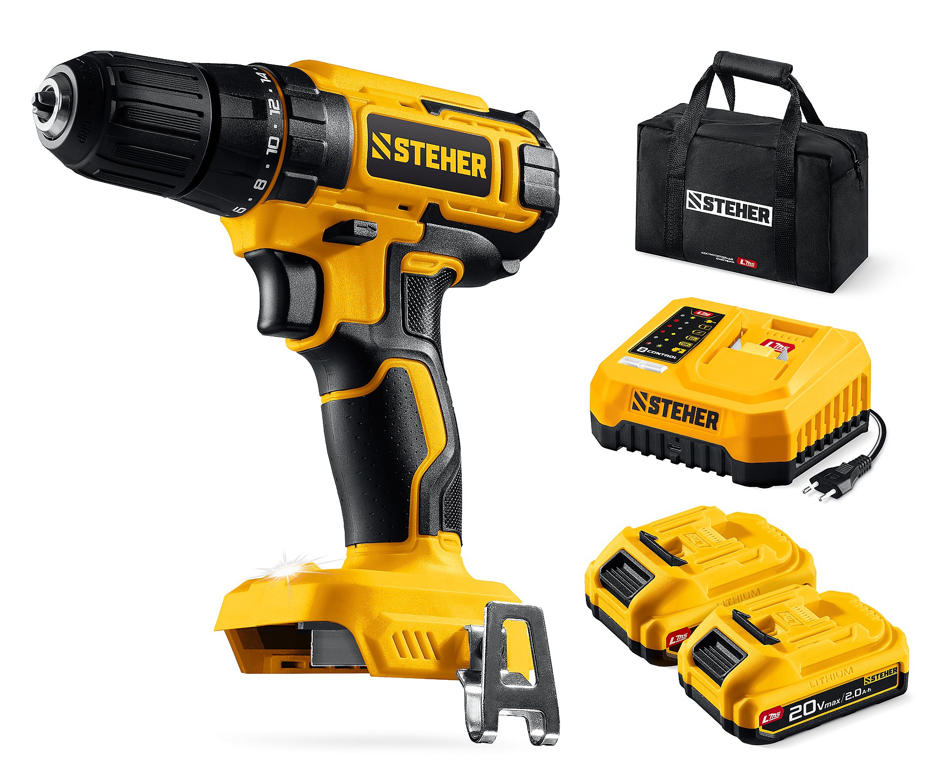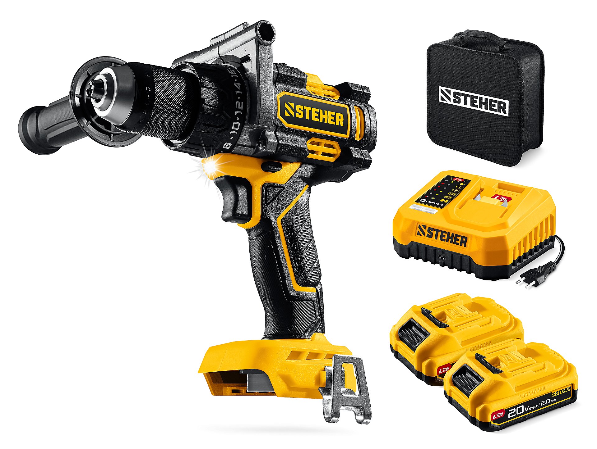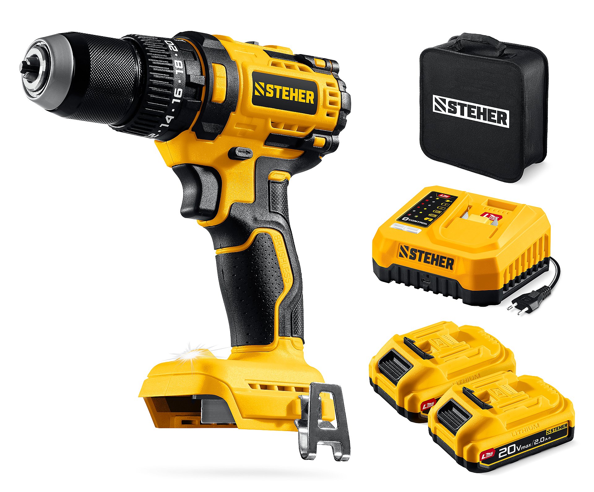 STEHER 20 В, 65 Н·м, 2 АКБ LMS (2 А·ч), бесщеточная ударная дрель-шуруповерт, сумка (CBS-65-22)