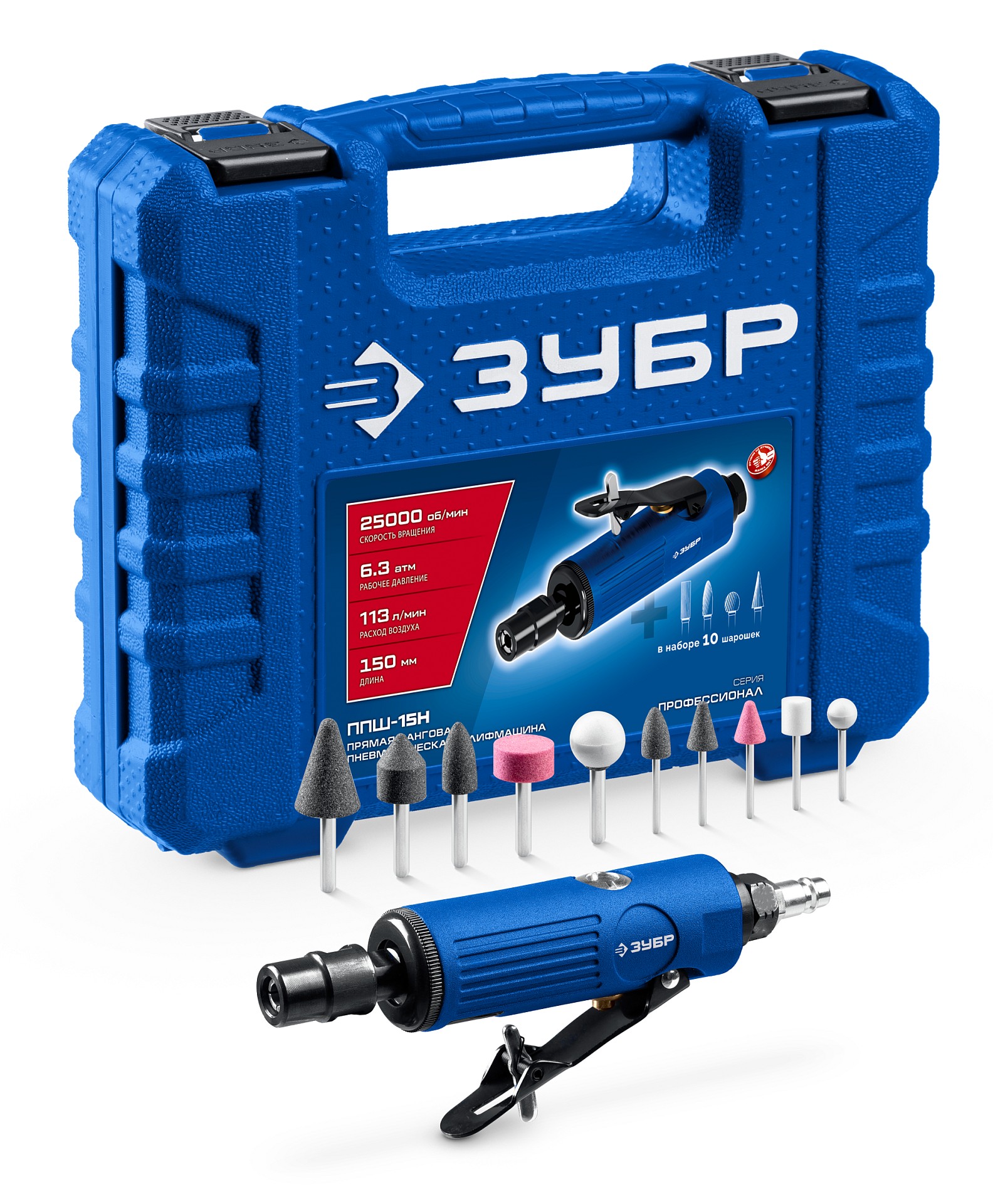 ЗУБР набор в кейсе: прямая цанговая пневмошлифмашина, 10 шарошек и оснастка, ПРОФЕССИОНАЛ (64333-H)