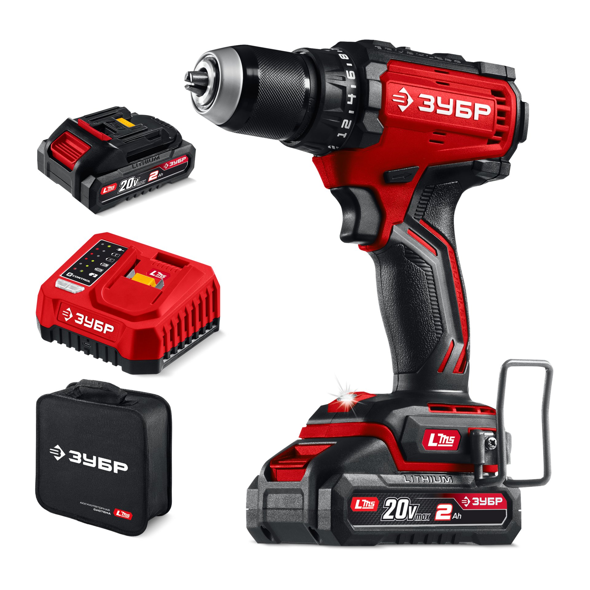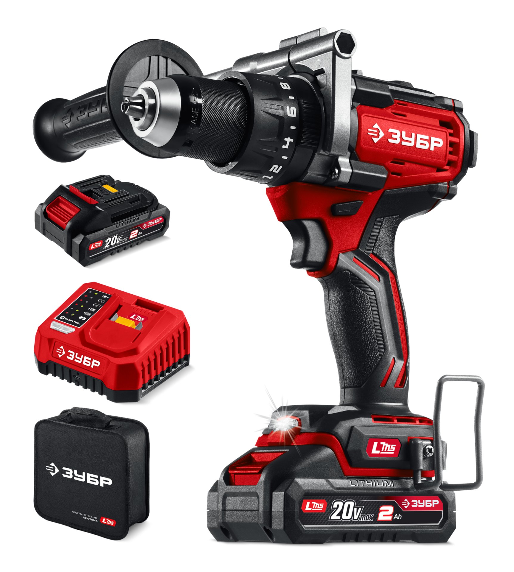 ЗУБР 20 В, 65 Н·м, 2 АКБ LMS (2 А·ч), бесщеточная дрель-шуруповерт, сумка (ДБ-65-22)