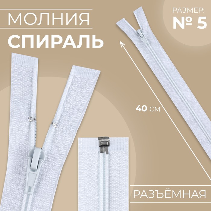 Молния «Спираль», №5, разъёмная, замок автомат, 40 см, белая