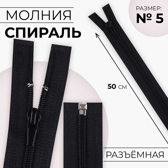 Молния «Спираль», №5, разъёмная, замок автомат, 50 см, чёрная