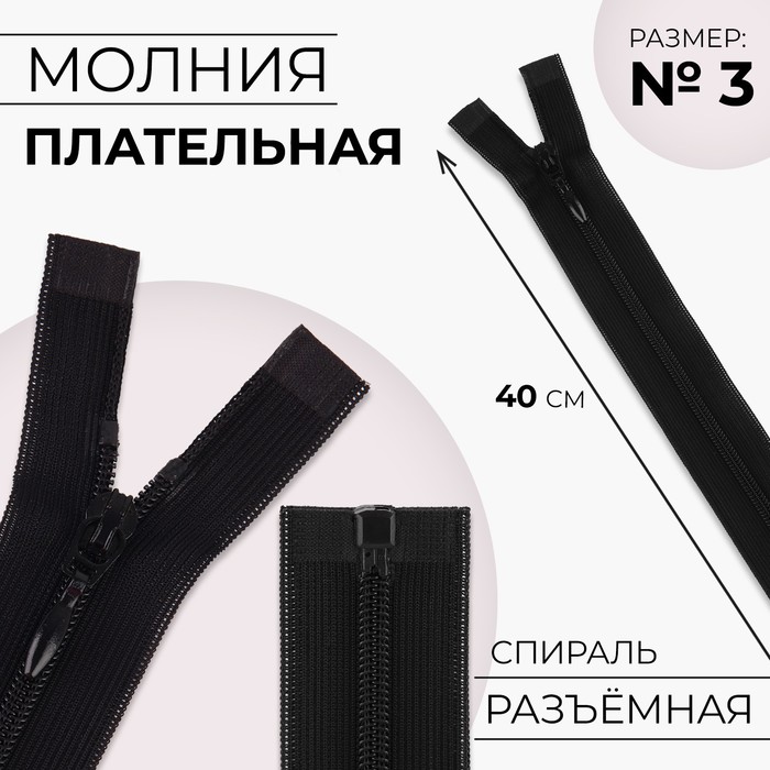 Молния «Спираль», №3, разъёмная, плательная, замок автомат, 40 см, цвет чёрный, цена за 1 штуку
