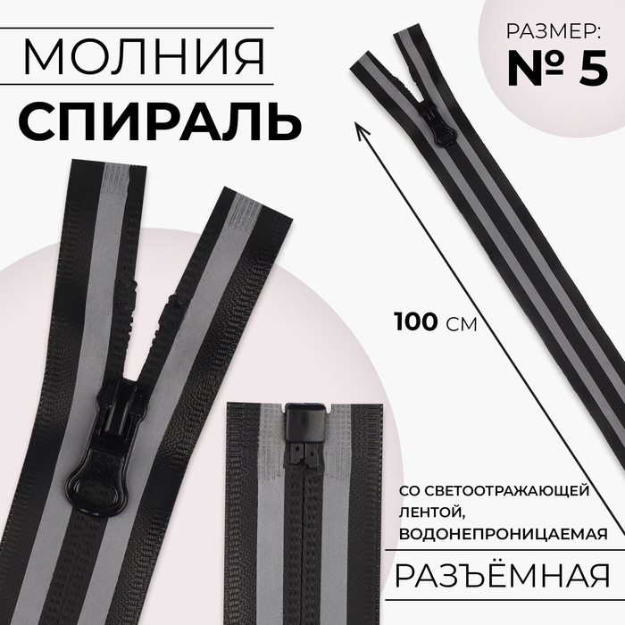 Молния «Спираль», №5, разъёмная, водонепроницаемая, со светоотражающей лентой, замок автомат, 100 см, чёрная, серая