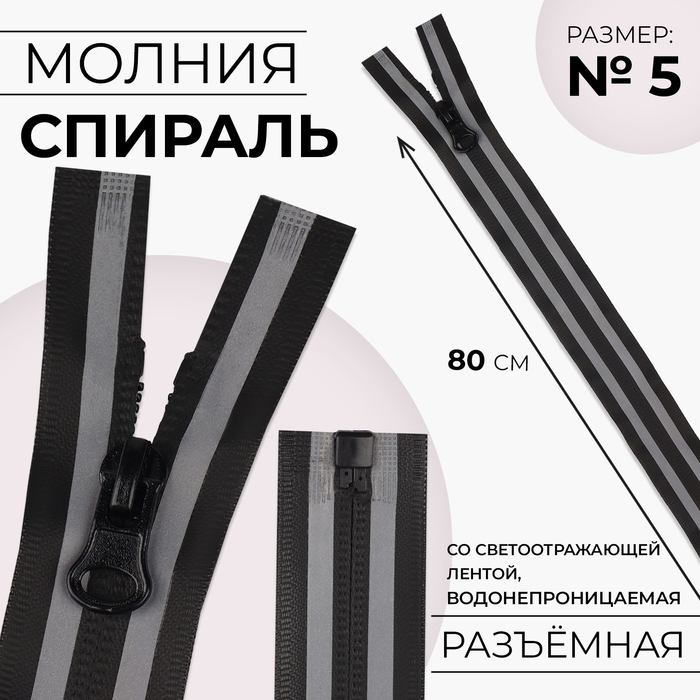 Молния «Спираль», №5, разъёмная, водонепроницаемая, со светоотражающей лентой, замок автомат, 80 см, чёрная, серая