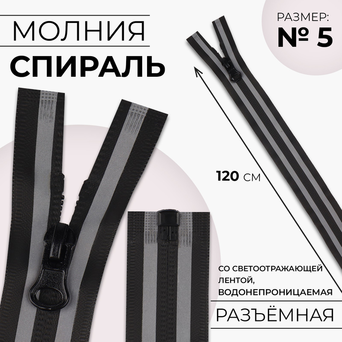 Молния «Спираль», №5, разъёмная, водонепроницаемая, со светоотражающей лентой, замок автомат, 120 см, чёрная, серая