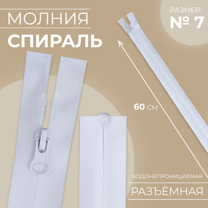 Молния «Спираль», №7, разъёмная, водонепроницаемая, замок автомат, 60 см, белая