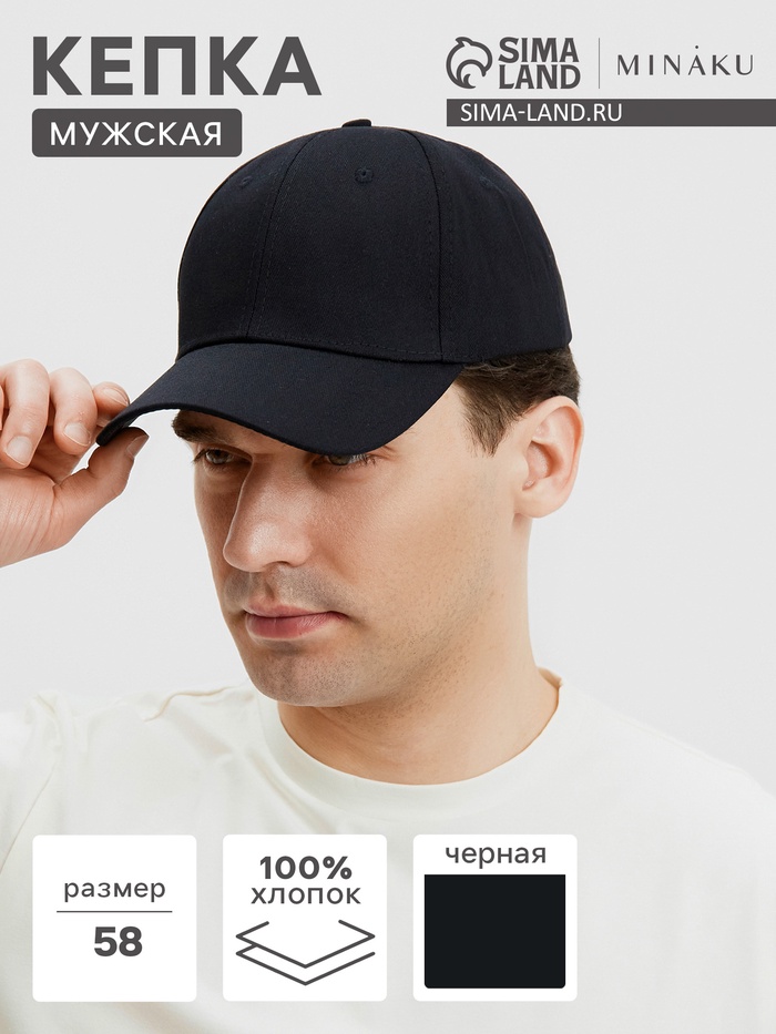 Кепка мужская однотонная MINAKU, размер 58, 100% хлопок, чёрная
