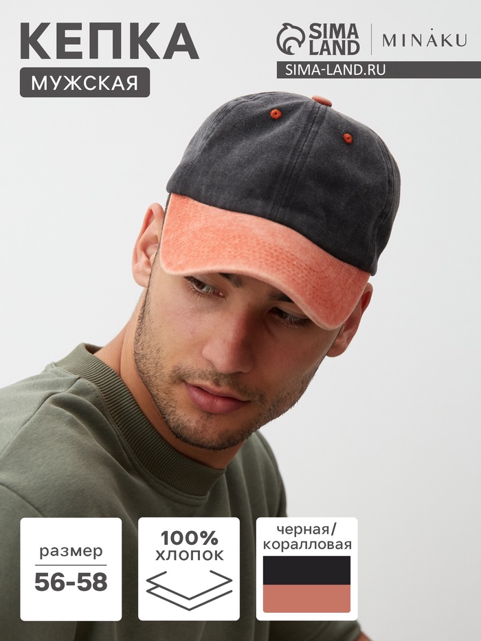 Кепка мужская MINAKU, размер 56-58, 100% хлопок, чёрная/коралловая