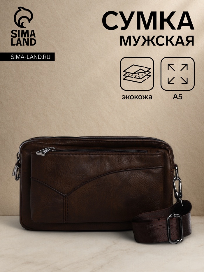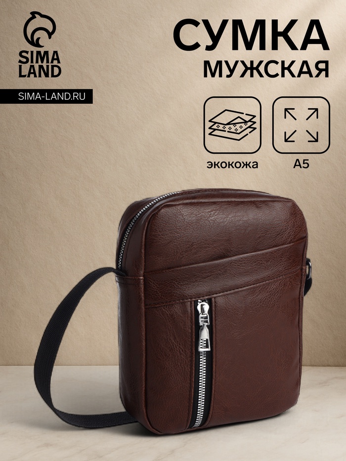 Сумка мужская через плечо на молнии, 2 наружных кармана, коричневая