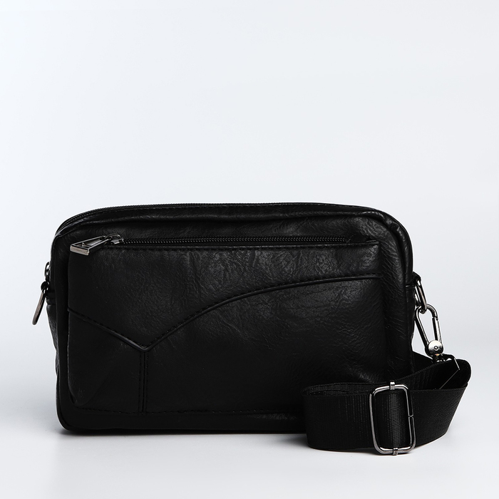 Сумка мужская на молнии, 5 наружных кармана, с ручкой, длинный ремень, чёрная