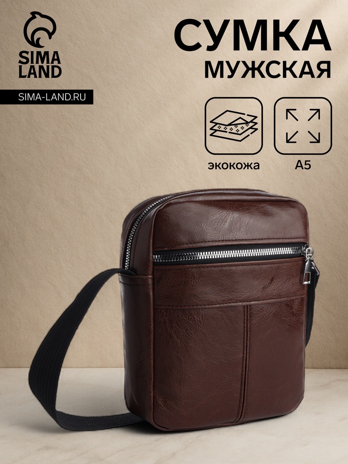 Сумка мужская через плечо на молнии, наружный карман, коричневая