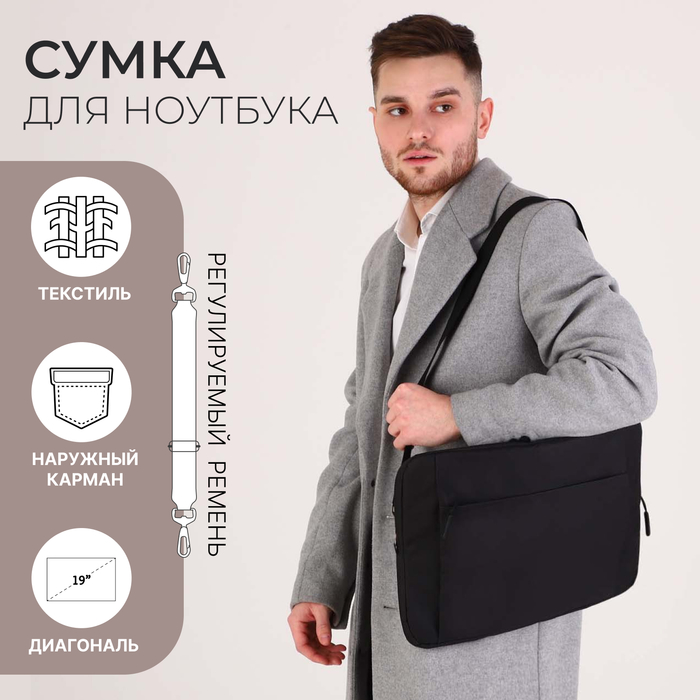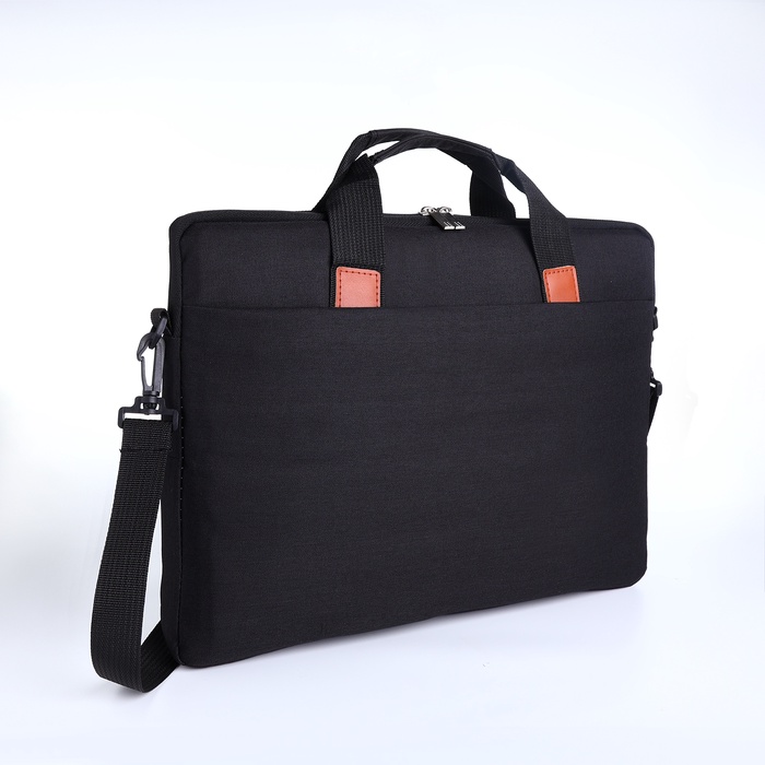 Сумка для ноутбука на молнии, наружный карман, длинный ремень, чёрная