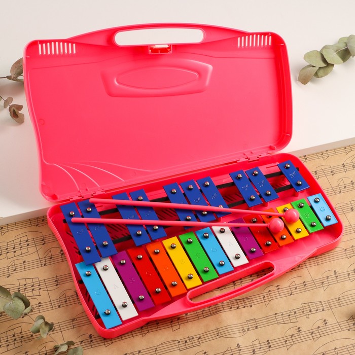 Металлофон музыкальный инструмент Music Life, 25 тонов, футляр, 2 палочки, розовый