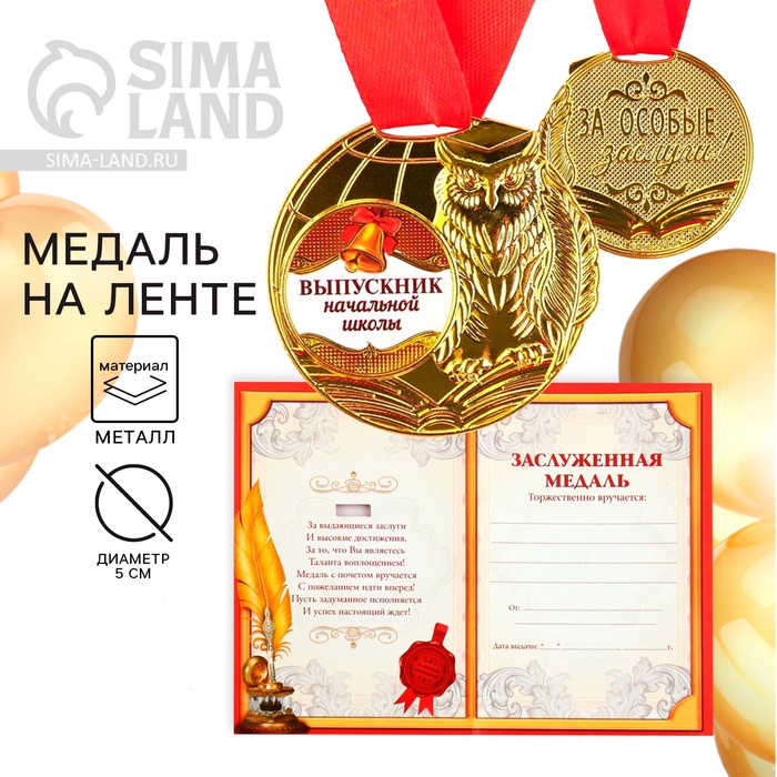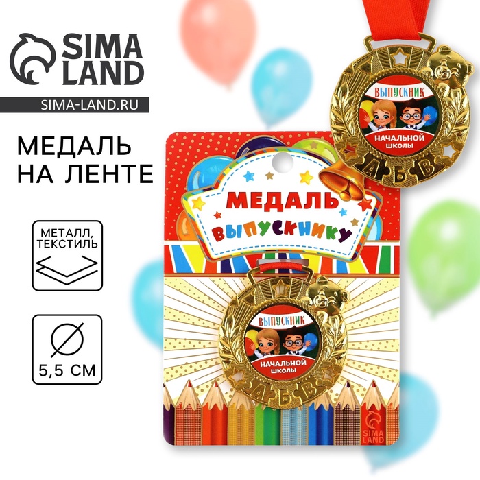 Медаль школьная на выпускной «Выпускник начальной школы», на ленте, золото, металл, d=5 см