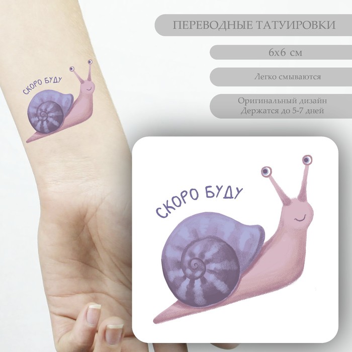Переводная тату на тело цветная «Улитка: Скоро буду», 6×6 см