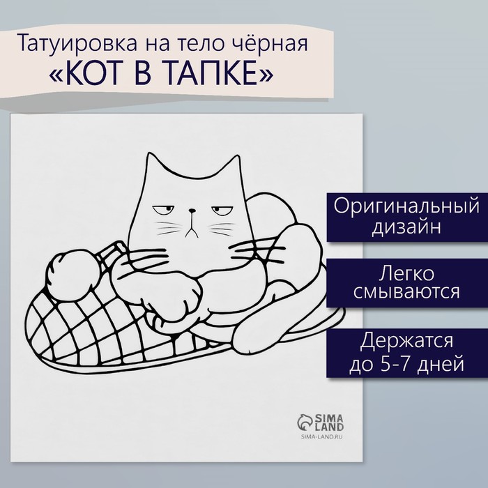 Переводная тату на тело чёрная «Кот в тапке», 6×6 см