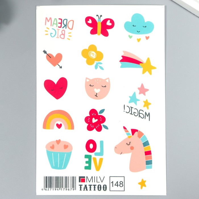 Переводная тату цветная «Единорожки с сердечками», временная татуировка, 6×6 см