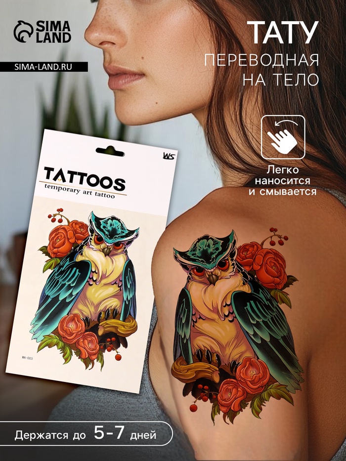 Переводная тату на тело цветная «Сова в пионах», 26.1×14.6 см