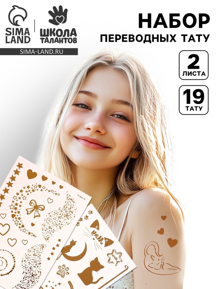 Переводные татуировки детские «Котики, сердца и звёзды», тату — 2 листа, золото
