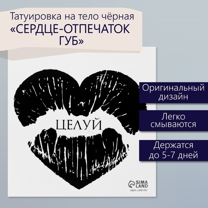 Переводная тату на тело чёрная «Сердце-отпечаток губ. Целуй», 6×6 см